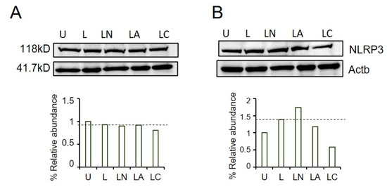 Total RNA was extracted using Trizol (Sigma, St. Louis, MO, USA) [78]. RNA concentration and integrity was determined by the 260:280 and 260:230 ratios measured by NanoDrop 2000 spectrophotometer (Thermo Scientific, Wilmington, DE, USA). Total RNA (500 nm) was used for cDNA synthesis using RevertAid First Strand cDNA Synthesis Kit (Thermo Fisher Scientific, Inc., Waltham, MA, USA). The expression of genes, NLRP3 (NLRP3), pro-caspase-1 (pro-CASP1) and pro-IL-1β, was analyzed using qPCR. Primers are summarized in Table 1 [21,79]. The RNA input was normalized using a housekeeping gene, Actin β (ACTB). The threshold cycle (Ct) for RNA expression was determined using the CFX384 Touch™ Real-Time PCR Detection System (Biorad, CA, USA). Fold changes of Ct values were calculated using the 2−ΔCt method.