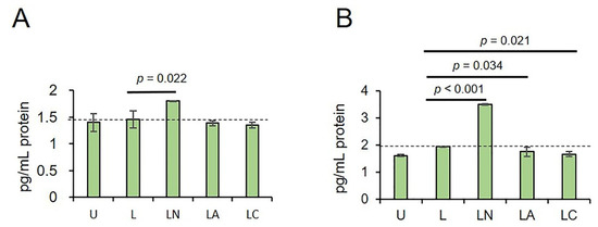 The effect of LPS-Az and LPS-Cf on IL-1β secretion in A549 (A) and PC3 cells (B). U: Untreated, L: LPS, LN: LPS-ng, LA: LPS-Az, LC: LPS-Cf. p values were calculated using one-way ANOVA and Tukey’s post-hoc tests. Dotted line indicates the secreted IL-1β in LPS primed cells. IL-1β levels were analyzed using Interleukin-1 beta-EIA-BEST kit (VECTOR-BEST, Novosibirsk, Russia). Results were captured using a TECAN Infinite 200 Pro fluorimeter (Grödig, Austria) at a wavelength of 450 nm and quantified using a standard curve. Each ELISA was completed in technical duplicates.