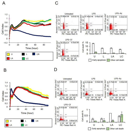 Next, the effect of LPS-only, LPS-Ng, LPS-Az and LPS-Cf treatment on A549 and PC3 cell growth kinetics was analyzed in real time for 96 h. Cell proliferation kinetics indicated that LPS-Az and LPS-Cf did not affect cell proliferation, while LPS-Ng substantially reduced the cell growth in both A549 and PC3 cells (Figure 6A,B). Additionally, LPS-Az and LPS-Cf had a limited effect on A549 or PC3 cell viability (Figure 6C,D, Table S3). These data demonstrate that NLRP3 activation reduces cell viability and proliferation. In contrast, macrolide Az and lactamide Cf do not cause NLRP3-dependent cell death.