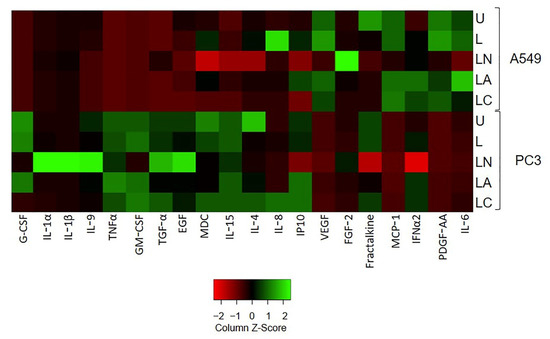 The effect of LPS-Az and LPS-Cf on cytokine secretion in A549 and PC3 cells. The heat map describes changes in the levels of cytokine secretion patterns in A549 and PC3 cells after LPS, LPS-Ng, LPS-Az and LPS-Cf treatments. The cytokines concentrations that were not detected were excluded from the heatmap graphs. U: Untreated, L: LPS, LN: LPS-Ng, LA: LPS-Az, LC: LPS-Cf.