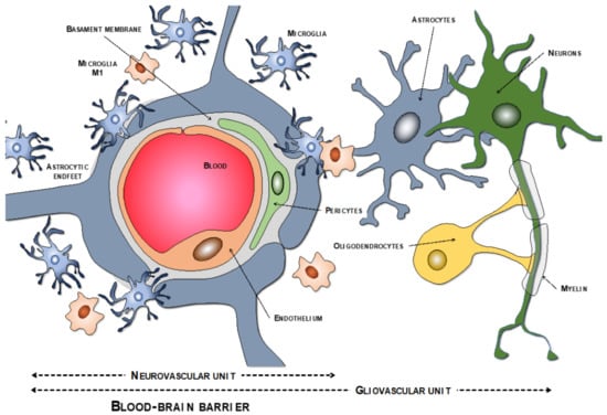 Microglia are immune cells that constitute up to 10–15% of glial cells. They are preferably located in the perivascular space of the CNS capillaries, and because of their importance in the integrity and regulation of the BBB, they form part of the neurovascular unit []. In normal situations, microglia are in a state of rest, immobile, without endocytic or phagocytotic activity, although with multiple cytoplasmic extensions in the extracellular medium of the CNS, which allow pathological or toxic mediators to be detected []. In these non-physiological situations, microglia are activated in two very different ways: M1 and M2. M1 microglia have pro-inflammatory functions and facilitate increased BBB permeability, while M2 microglia are immunoregulatory, anti-inflammatory, and reparative of the BBB. It also has the phagocytic capacity to remove cellular debris and contribute to the repair of neurons [,].