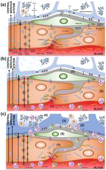 The endothelial cells are described as the main cells involved in the structure of the BBB. However, these cells are not by themselves capable of carrying out all the functions that the BBB must perform. Thus, close anatomical and functional contact with the pericytes is required. Both types of cells are surrounded by the basement membrane, constituting a vascular unit (Figure 1). Outside it, the vascular basement membrane is reinforced with a parenchymal matrix where the feet of astrocytes rest, which are accompanied by cells with immune functions, such as microglia and macrophages, and neurons. All this cellular functional group constitutes the neurovascular unit (Figure 2a). Therefore, the normal functioning of the BBB requires an adequate interaction between a luminal component, consisting of specific endothelial cells reinforced by pericytes and a vascular basement membrane, and an abluminal component consisting of an extracellular matrix, astrocytes, microglia, macrophages, and neurons [,,,].