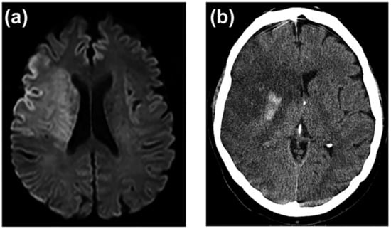 After the first few hours of stroke, all the mechanisms that cause the dysfunction, and later the degradation, of the BBB [] are progressively set in motion, with the consequent passage of water and proteins from the vascular space to the interstitial space, which causes vasogenic oedema. In contrast to cytotoxic oedema, vasogenic oedema is isosmotic and accumulates primarily in the extracellular compartment, causing a considerable increase in lesion volume. Reperfusion of ischemic tissue can increase the volume of vasogenic oedema [] (Figure 4). The entry of water into the extracellular space causes the DWI-MRI signal to disappear, and it becomes more evident on CT and MRI on T2-weighted sequences []. Unlike neuroimaging of cytotoxic oedema, CT, or T2-weighted MRI images of vasogenic oedema are excellent markers of severe BBB disturbance (Figure 5).