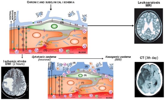 BBB dysfunction is common in all forms of cerebral ischemia and many other neurological diseases. However, the intensity and time of the appearance of this dysfunction vary. In subclinical cerebral ischemia, the dysfunction of the BBB is fundamentally transcellular, with the passage of molecules and cells in certain territories, fundamentally of the white matter []. In these situations, the perivascular inflammation is discreet, and although there is an increase in perivascular water, there is no space problem, and the oedema is limited.