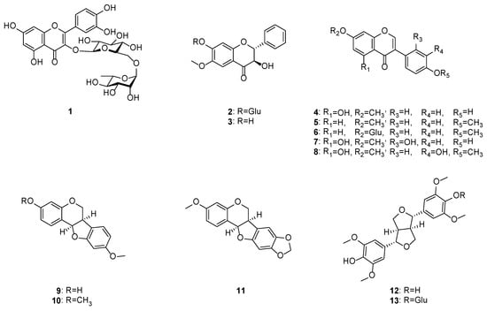 6-methoxyflavanone (3) [], prunetin (4) [], 7,4′-dimethoxyisoflavone (5) [], ononin (6) [], cajanin (7) [], 7,4′-dimethyl-3′-hydroxygenistein (8) [], medicarpin (9) [], homopterocarpin (10) [], pterocarpin (11) [], (+)-syringaresinol (12) [], and (−)-syringaresinol-4-O-β-d-glucopyranoside (13) []. This is the first report of compounds 1–13 from C. lineata, and all the isolates were evaluated for their inhibitory activity on the LPS-stimulated production of the proinflammatory mediators NO, IL-6, and TNF-α in RAW264.7 cells.