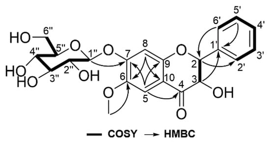 Compound 2 was isolated as a yellow syrup with [α] −50.8 (MeOH, c 0.1). Its molecular formula of C22H24O10 was determined from its HRESIMS data (m/z 447.1288 [M − H]–, calcd. 447.1291, Figure S2). The 1H and 13C NMR spectra (Table 1, Figures S3–S8) of compound 2 showed resonances that corresponded to an unsubstituted benzene ring [δH 7.55 (d, J = 7.0 Hz, H-2′, -6′), 7.42 (t, J = 7.0 Hz, H-3′, -5′), and 7.39 (t, J = 7.0 Hz, H-4′); δC 128.1 (C-2′, -6′), 128.2 (C-3′, -5′), 128.6 (C-4′), 137.5 (C-1′), B-ring], two singlet signals of a para-aromatic ring [δH 7.21, s, (H-5) and 6.77, s, (H-8); δC 107.2 (C-5), 103.3 (C-8), 112.3 (C-10), A-ring], three oxygenated aromatic carbons [δC 156.6 (C-9), 153.6 (C-7), 144.5 (C-6), A-ring], dihydroflavanol [δH 5.20 (d, J = 11.9 Hz, H-2) and 4.59 (d, J = 11.9 Hz, H-3); δC 83.9 (C-2), 72.6 (C-3)], one carbonyl carbon [δC 192.6 (C-4)], a sugar moiety bearing a β-anomeric proton [δH 5.05 (d, J = 7.7 Hz, H-1″), 3.25, (m, H-2″, -3″), 3.37, (m, H-4″), 3.14 (t, J = 9.1 Hz, H-5″), 3.63 (dd, J = 11.9, 9.1 Hz, H-6a″), 3.40 (dd, J = 11.9, 5.6 Hz, H-6b″); δC 99.4 (C-1″), 73.0 (C-2″), 76.6 (C-3″), 77.0 (C-4″), 69.4 (C-5″), 60.5 (C-6″)], and one methoxy group [δH 3.79, s; δC 55.9 (OCH3-6)]. The key COSY cross peaks between H-2/H-3 and H-4’/H-3′, -5′/H-2′, -6′ and the key HMBC cross peaks between H-2/C-2′, -6′, H-3/C-1′, H-5/C-4, -7, -9, H-8/C-6, -10, and OCH3/C-6 supported that the structure of compound 2 was similar to that of (2R,3R)-3,7′-dihydroxy-6-methoxyflavanone (6) except for a monosaccharide group (Figure 2). The linkage of the monosaccharide unit at C-7 of the aglycone was determined by the HMBC correlation between the anomeric proton at δH 5.05 (H-1″) and the oxygenated aromatic carbon at δC 153.6 (C-7). The absolute configuration at C-2 and C-3 of compound 2 were deduced as 2R and 3R on the basis of the observation of a positive and negative Cotton effect at 350 nm and 313 nm in the circular dichroism (CD) spectrum (Figure S9) [].