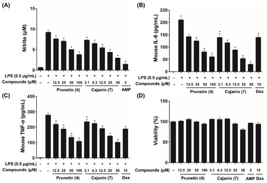 Effects of prunetin (4) and cajanin (7) on the inflammatory mediators NO (A), IL-6 (B), and TNF-α (C) in LPS-stimulated RAW264.7 macrophages. NO, IL-6, and TNF-α secretion was measured by NO and ELISAs as described in the Materials and Methods. Cytotoxicity was not observed at the IC50 concentrations of prunetin (4) and cajanin (7) (D), and all data are expressed as the mean ± SEM of three independent experiments. Statistical significance was considered at * p < 0.05 compared to the LPS-only treatment group. 2-Amino-4-methylpyridine (AMP) and dexamethasone (Dex) were employed as positive controls.