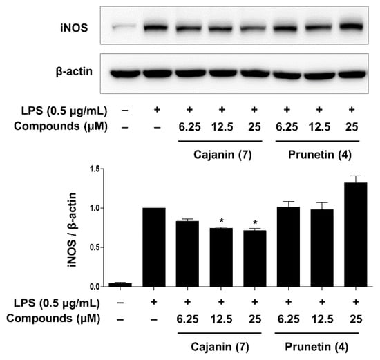 Effects of prunetin (4) and cajanin (7) on LPS-activated iNOS protein expression in macrophages. Western blot analysis was performed to measure iNOS protein levels normalized to that of β-actin as the loading control. The ratio of the iNOS/β-actin band intensities was calculated using the ImageJ program. The results are shown as the mean ± SEM of three independent experiments. Asterisks indicate a significant difference compared to the LPS alone group (* p < 0.05).