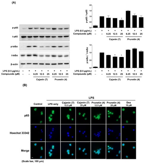 Effect of prunetin (4) and cajanin (7) on the phosphorylation of NF-κB (p65) and IκBα and nuclear translocation of NF-κB (p65) in LPS-induced macrophage cells. (A) Whole-cell lysates were prepared from RAW264.7 cells treated with or without LPS (0.5 μg/mL) and were subjected to Western blot analysis to investigate the phosphorylation of NF-κB (p65) and IκBα. The band intensities of phosphorylation of IκBα (p-IκBα) and NF-κB (p-p65) are represented as fold-change values using ImageJ software compared to total-IκBα (t-IκBα) and total-p65 (t-p65), which was used as a loading control. Data are indicated as the mean ± SEM of three independent experiments. Significant differences are expressed as asterisks between the LPS only and experimental groups (* p < 0.05). (B) Immunocytochemical analysis was performed to explore the nuclear localization of NF-κB (p65) using the fluorescence of Alexa Fluor 488 and Hoechst 33342. Dexamethasone (Dex) served as a positive control.