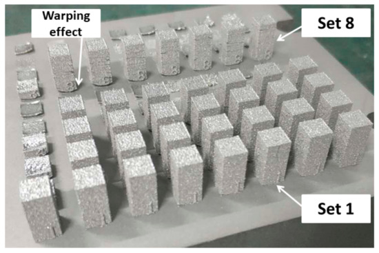 It is interesting to note that the effect of generated residual stresses causing the warping effect is clear in the geometry of the printed samples. As observed in Figure 3, a more pronounced warping effect is observed in the samples (printed from about 58 wt.% Ni + 42 wt.% Ti powder mixture) processed by printing set 8, under which the samples were printed by a laser power of 60 watts, as compared to printing set 1 where the samples were printed under identical printing parameters but a laser power of 50 watts. The bottom of these samples is curvier than the ones processed by printing set 1.