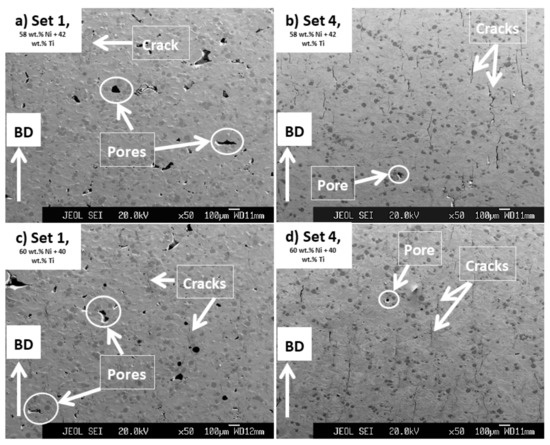 As seen in Figure 4, regardless of the composition of the powder mixtures, cracks and pores are readily observed in the microstructures of the printed parts. However, parts printed by set 1 were mostly consisting of pores (Figure 4a,c) and the ones printed by set 4 with many cracks formed in parallel to the BD (Figure 4b,d). In addition, it is noted that the pores observed in the microstructures of parts printed by set 1 were larger than those existing in parts processed by set 4 and some of these pores had irregular geometries being almost perpendicular to BD.