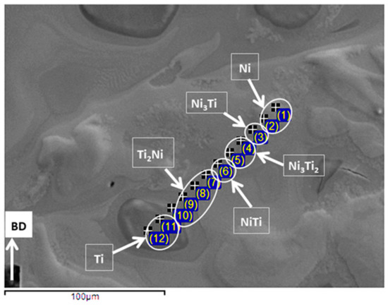 Regarding the phase composition of printed samples, the microstructures of all the samples were similar together and the applied printing processes did not lead to a complete reaction between the elemental Ni and Ti existing in the powder mixtures. Figure 6 shows the results obtained from EDS studies and the existence of an inhomogeneous microstructure containing Ni-rich and Ti-rich areas is clear in the processed samples. Note that the identified phases were interpreted based on the Ni: Ti ratio reported for different NiTi phases in [22]. Ti-rich regions are darkest under the SEM images (Figure 4, Figure 5 and Figure 6) and the results show that they contained about 1–5 wt.% Ni in their composition, suggesting the formation of βTi. The areas between the Ni-rich and Ti-rich regions, which appear to be the original cores of the Ti and Ni elemental particles used in the powder mixtures, were surrounded by Ti2Ni, NiTi, Ni3Ti2, and Ni3Ti in a gradient mode. These results are in accordance with the findings of previous research and the one conducted on 63 wt.% Ni + 37 wt.% Ti powder mixture [26,36]. The formation of undesired intermetallic phases, pure nickel, and pure titanium is typical in parts processed from elementally blended powders.