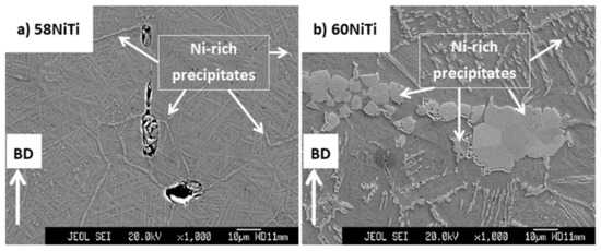 Images obtained from the cross-section of HIP-treated (at 1050°C for 4 h under an applied pressure of 180 MPa) samples being printed from (a) 58 wt.% Ni + 42 wt.% Ti and (b) 60 wt.% Ni + 40 wt.% Ti powders mixtures. Microstructures complying with those of (a) 58NiTi and (b) 60NiTi, respectively, were obtained as a result of this treatment. Some of the Ni3Ti and Ni3Ti2 Ni-rich phases seen in the microstructure of these samples are shown in the images.