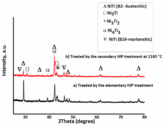 XRD patterns of (a) 60NiTi samples processed by elementary HIP treatments, from parts printed by set 4 having an energy input of 39.68 J/mm3 and (b) the same 60NiTi samples treated by the secondary HIP treatment conducted at 1165 °C for 1 h and under an applied pressure of 180 MPa.