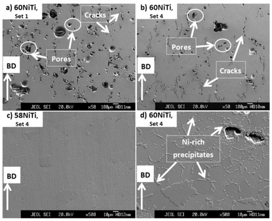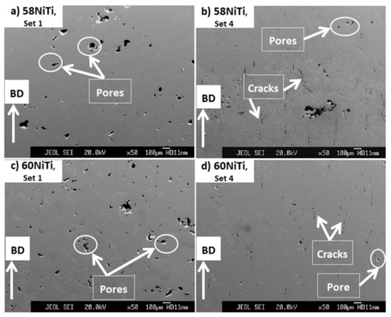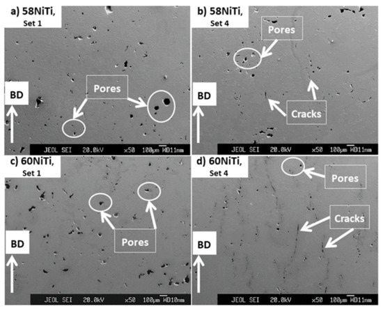 Images obtained from the cross-section of samples processed from powder mixtures having (a,b) 58 wt.% Ni + 42 wt.% Ti and (c,d) 60 wt.% Ni + 40 wt.% Ti compositions by processing sets 1 and 4 having energy inputs of 27.70 and 39.68 J/mm3, respectively. Some of the cracks and pores seen in the microstructure of these samples are shown in the images.