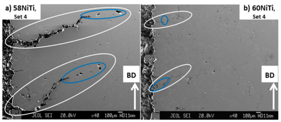 Images obtained from the cross-section of (a) 58NiTi and (b) 60NiTi parts processed from parts printed by processing set 4 having an energy input of 39.68 J/mm3. The white ovals show the total length of cracks, and the blue ones show the areas where the cracks were thought to be closed as a result of the applied HIP treatment.