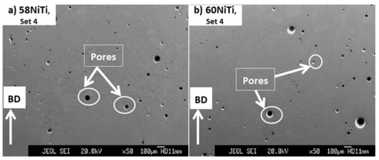 In terms of existing flaws such as cracks and pores, the obtained microstructures, despite being compositionally very different as compared to their as-printed conditions (Figure 4, Figure 5 and Figure 6), were very similar to the as-printed ones. As presented in Figure 9, the characteristics of flaws existing in the microstructure of each HIP-treated part were similar to its as-printed condition. In essence, cracks and pores were present in the microstructures of both 58NiTi and 60NiTi parts. The microstructures of parts obtained from those printed by set 1 were dominated by large pores; the ones processed from those printed by set 4, with cracks.