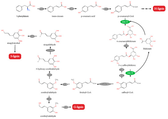 Lignin, one of the essential components of the plant cell wall, serves vital biological tasks such as providing support for defense and transport [1,2]. It can increase the mechanical strength of plant tissues and stimulate the plant’s defensive mechanism [3]. Lignin is formed by the polymerization of interconnected lignin monomers, which can be categorized as p-hydroxyphenyl lignin (H-lignin), guaiacyl lignin (G-lignin), and syringyl lignin (S-lignin) based on the kinds of the monomers [4]. Through the phenylpropanoid pathway, one of the most significant branches of so-called plant specialized metabolism and lignin precursors are formed, and HCT is a crucial enzyme in the process’s initial steps [5]. HCT employs p-coumaroyl-CoA as the acyl donor and either shikimic acid or quinic acid as the acceptor, resulting in the respective shikimate or quinate ester [3,5]. Additionally, HCT exhibited reverse catalysis for caffeinyl COA. Caffeoyl-CoA, the precursor of guaiacyl and syringyl lignin units, is produced by the HCT transfer of the caffeoyl moiety of 5-O-caffeoylshikimic to CoA (Figure 1) [6]. HCT appears to serve a crucial role both upstream and downstream of the 3-hydroxylation stage in the phenylpropanoid pathway [7].