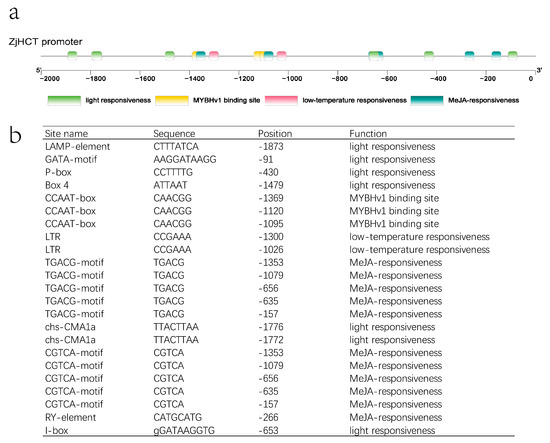 Analysis of the upstream sequence of ZjHCT4. (a) Cis-acting elements upstream of ZjHCT4. (b) A list of putative transcription factor binding sites upstream of ZjHCT4.