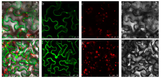 Subcellular localization of ZjHCT4. (a–d) Fusion protein of ZjHCT4 and YFP fluorescent detection. (e–h) YFP fluorescent detection. (a,e): merged signal; (b,f): FP fluorescence; (c,g): Y chlorophyll autofluorescence; (d,h): Bright light.