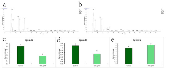 Change of monomer content of lignin. (a,b) Typical gas chromatograms show thioacidolysis products of transgenic (a) and control plants (b). (c–e) Monomer content of lignin G (c), lignin H (d), lignin S (e). Statistical significance of differences was assessed using the Student’s t-test. Different letters above the columns indicate significant differences (p < 0.05, n = 3).