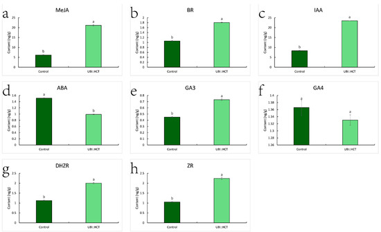 Hormone contents of transgenic and control plants, including MeJA (a), BR (b), IAA (c), ABA (d), GA3 (e), GA4 (f), DHZR (g), ZR (h). Statistical significance of differences was assessed using the Student’s t-test. Significant differences (p < 0.05, n = 3) are shown by different letters.