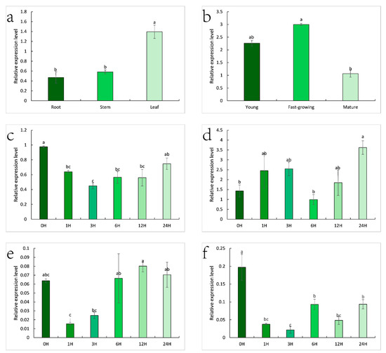 Expression pattern of ZjHCT4 in Zoysia japonica. (a) Expression profiles of ZjHCT4 expression in the root, stem, and leaf. (b) The pattern of ZjHCT4 expression in leaves at various stages of development. (c–f) Leaf expression pattern after treatments with 0.5 mM SA (c), 10 mM ABA (d), 10 μM GA3 (e), and 10 mM MeJA (f). Statistical significance of differences was assessed using one-way ANOVA with Duncan test. Significant differences (p < 0.05, n = 3) are represented by various letters above the columns.