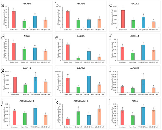 Expression levels of AsCAD5 (a), AsCAD6 (b), AsCCR2 (c), AsPAL (d), As4CL5 (e), As4CLL4 (f), As4CLL7 (g), AsPOD1(h), AsCOMT (i), AsCCoAOMT1 (j), AsCCoAOMT2 (k), AsCSE (l), in leaves and stems of control and transgenic plants. The stem of control (red), leaf of control (green), stem of transgenic plant (blue), and leaf of transgenic plant (pink) columns were separately compared using one-way ANOVA with Duncan test. Differences that are statistically significant (p < 0.05, n = 3) are denoted by different letters above the columns.