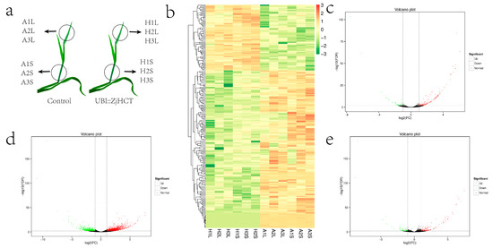 Transgenic and control plants were chosen for sampling and transcriptome analysis (Figure 10a). On the DEGs (differentially expressed genes) that were screened, hierarchical cluster analysis was done, and genes with similar expression characteristics were clustered to illustrate the patterns. Clustering results of DEGs revealed that gene expression of transgenic plants and control plants differed significantly (Figure 10b). In leaves of transgenic vs. control plants, 210 DEGs were identified in the DEG analysis, with 163 upregulated genes and 447 downregulated genes (Figure 10c). The stems of transgenic vs. control plants contained a total of 2204 differently expressed genes, of which 1455 were up-regulated and 749 were down-regulated. The aboveground sections (leaves and stem) of transgenic vs. control plants had a total of 217 differentially expressed genes, with 153 up-regulated and 64 down-regulated. These results imply that ectopic expression of ZjHCT4 may result in differential gene expression in stems and leaves, with stems containing a greater number of genes with differential expression.