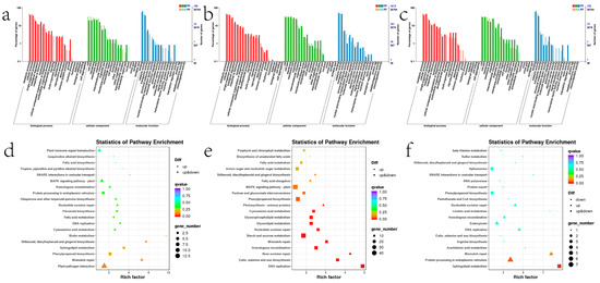 The GO enrichment and KEGG enrichment results of the up-regulated and down-regulated DEGs. GO enrichment results of DEGs in leaves (a), stems (b), aboveground parts (c), and KEGG enrichment results of leaves (d), stems (e), and aboveground parts (f) of transgenic and control plants with q-value ≤ 0.05 were considered significantly enriched.