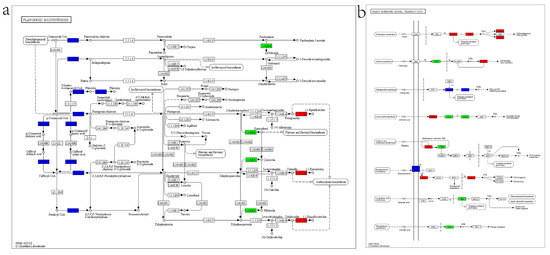 The most prevalent KEGG pathways in stems are “Starch and sucrose metabolism”, “MAPK signaling pathway -plant”, and “Phenylpropanoid biosynthesis”. In addition, 11 and 39 differentially expressed genes in stems were localized to “Flavonoid biosynthesis” and “Plant hormone signal transduction”, respectively, whereas in leaves there were 2 and 4 gene localization (Figure 12 and Supplementary Figure S3).