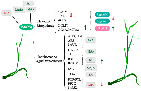 The altered expression of multiple genes in the flavonoid biosynthesis pathway suggests that ZjHCT4 may disrupt flavonoid biosynthesis and modify the synthesis of lignin precursors (Figure 12a and Supplementary Figure S3a). Meanwhile, ectopic expression of ZjHCT4 can affect multiple genes in “Plant hormone signal transduction” pathway, so affect the signal transduction of auxin, cytokinine, gibberellin, abscisic acid, jasmonic acid, and salicylic acid (Figure 12b and Supplementary Figure S3b).
