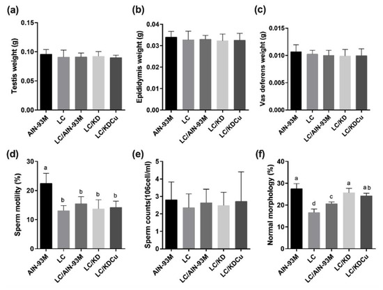 Effects of the low carbohydrate diet and curcumin on (a) testis, (b) epididymis, (c) vas deferens, (d) sperm motility, (e) sperm counts, (f) percentage of normal sperm morphology in male mice. Data are expressed as means ± SD. n = 11–12 per group. Bars (a, b, c, d) with different letters indicate that values are significantly different. (One-way ANOVA, Duncan’s test, p < 0.05). AIN-93M: AIN-93M diet; LC: low carbohydrate diet; LC/AIN-93M: low carbohydrate diet changed to AIN-93M diet; LC/KD: low carbohydrate diet changed to ketogenic diet; LC/KDCu: low carbohydrate diet changed to ketogenic diet and curcumin.