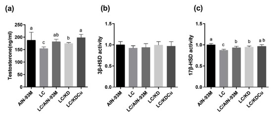 The concentration of testosterone plays an important role in spermatogenesis [39]. In this study, we measured the level of testosterone and protein expressions of markers involved in the testosterone biosynthesis pathway. The data show that the testosterone concentration in the LC group was significantly lower than that in the AIN-93M group and increased in the LC/AIN-93M and LC/KDCu groups (Figure 5). Moreover, our results show that the LC group had a lower protein expression of 17β-hydroxysteroid dehydrogenase than the AIN-93M group, and this was increased in the LC/AIN-93M, LC/KD and LC/KDCu groups (Figure 5 and Figure 6). Sharma et al. established a rat model of exposure to insecticides/xenobiotics in which the animals received supplementation with curcumin and quercetin. It was demonstrated that curcumin and quercetin could protect against insecticides and xenobiotic-induced sperm count, testosterone concentration, activities of 3β-HSD and 17β-HSD, and oxidative damage [40], and the increases in lipid peroxidation and oxidative stress may have contributed to the decreases in sperm count and the concentration of testosterone. On the other hand, it is possible that hypothalamic–pituitary–gonadal axis negative feedback inhibition may partly be responsible for the reduced testosterone level.