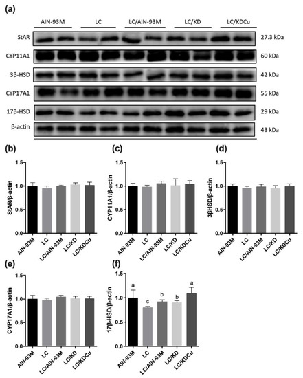 The testicular testosterone, 3β-HSD and 17β-HSD levels were measured by ELISA. The results show that the LC and LC/KD groups had significantly lower testosterone concentrations than the AIN-93M group. Additionally, the LC group had a lower 17β-HSD level than the other groups. In contrast, the LC/KDCu group had an increased testosterone concentration and 17β-HSD level (Figure 5). The protein expressions of enzymes involved in the testosterone biosynthesis pathway are shown in Figure 6, and there were no statistical differences in the expressions of StAR, CYP11A1, 3β-HSD or CYP17A1. The LC group had a significantly lower 17β-HSD expression than the AIN-93M group, whereas the LC/AIN-93M and LC/KDCu groups had significantly increased expressions.