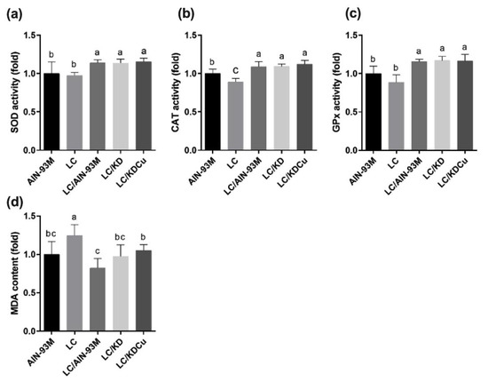 Effects of the low carbohydrate diet and curcumin on (a) SOD activity, (b) CAT activity, (c) GPx activity, (d) MDA content in male mice. Data are expressed as means ± SD. n = 6–9 per group. Bars (a, b, c) with different letters indicate that values are significantly different. (One-way ANOVA, Duncan’s test, p < 0.05). AIN-93M: AIN-93M diet; LC: low carbohydrate diet; LC/AIN-93M: low carbohydrate diet changed to AIN-93M diet; LC/KD: low carbohydrate diet changed to ketogenic diet; LC/KDCu: low carbohydrate diet changed to ketogenic diet and curcumin.