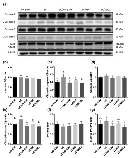 As shown in Figure 7, the levels of SOD, GPx and CAT in the LC group were significantly lower than in the other groups. In terms of lipid peroxidation, the MDA concentration in the LC group was significantly higher than in the other four groups. A low-carbohydrate diet resulted in higher protein expressions of the ratio of the pro-apoptotic factor Bax to the anti-apoptotic factor Bcl-xl (Bax:Bcl-xl), cleaved caspase 8, caspase 3 and PARP, while these changes were attenuated following a change in the diets of the AIN-93M and LC/KDCu groups (Figure 8 and Figure 9). The examination of inflammation-related factors showed an increasing NF-κB protein expression in the LC and LC/KD groups and a notably lower NF-κB expression in the LC/KDCu group (Figure 10).