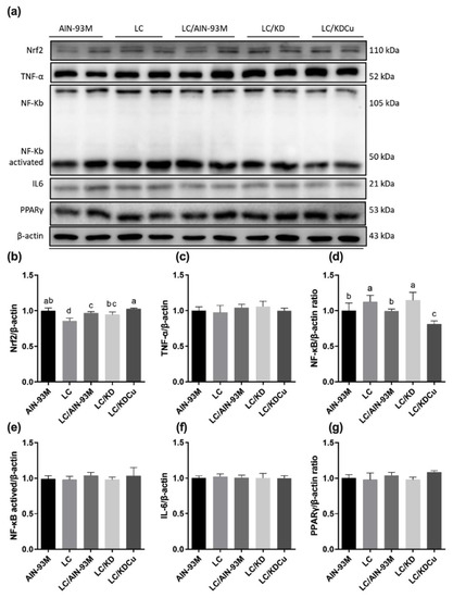 Effects of the low carbohydrate diet and curcumin on (a) protein expressions in each group, (b) Nrf2, (c) TNF-α, (d) NF-κB, (e) NF-κBactived, (f) IL-6, (g) PPARγin male mice. Data are expressed as means ± SD. n = 6–9 per group. Bars (a, b, c, d) with different letters indicate that values are significantly different. (One-way ANOVA, Duncan’s test, p < 0.05). AIN-93M: AIN-93M diet; LC: low carbohydrate diet; LC/AIN-93M: low carbohydrate diet changed to AIN-93M diet; LC/KD: low carbohydrate diet changed to ketogenic diet; LC/KDCu: low carbohydrate diet changed to ketogenic diet and curcumin.