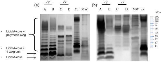Our P. gingivalis LPS electrophoretic profile exhibited a high mobility region of unsubstituted lipid A-core clearly defined in the gel and a preferential length of ≥8 OAg repeated units, with a molecular weight between 43 and 100 KDa, consistent with previous descriptions in the literature in other P. gingivalis strains [41,42,43,44]. On the other hand, compared to P. gingivalis LPS, P. endodontalis LPS exhibited a faint lipid A-core region not substituted by OAg and a preferential length of 8 to 14 OAg substitutions repeating units.