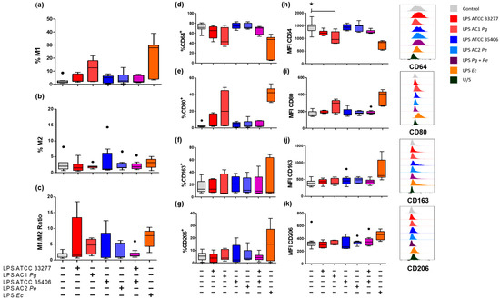 Evaluation of single positive M2 macrophage populations showed no significant changes in any of the evaluated conditions. P. gingivalis and/or P. endodontalis LPS did not change CD163 or CD206 surface levels (MFI), although E. coli LPS induced a CD163 increase above unstimulated control (Figure 2f,g,j,k).