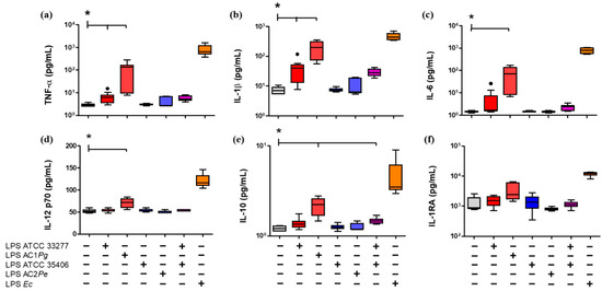 Next, the cytokine profiles associated with M1 (TNF-α, IL-1β, IL-6, and IL-12) and anti-inflammatory M2 (IL-10 and IL-1RA) were evaluated in the supernatant of the stimulated THP-1 macrophages (Figure 3). P. gingivalis LPS stimulated the secretion levels of pro-inflammatory cytokines similarly to E. coli LPS, but in a minor amount, compared with the unstimulated control. Specifically, P. gingivalis ATCC 33277 LPS induced increases in TNF-α and IL-1β. Moreover, LPS from AC1Pg induced increases in TNF-α, IL-1β, IL-6, and IL-12 compared to unstimulated THP-1 macrophages (p < 0.05) (Figure 3). In the case of the anti-inflammatory cytokines, LPS from AC1Pg induced an increase of IL-10 compared to unstimulated cells (p < 0.05).