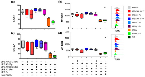 Specifically, P. gingivalis LPS from our clinical isolate (AC1Pg) induced a decrease in CD64 surface levels and an increase in TNF-α, IL-1β, IL-6, and IL-12 cytokine secretion; while P. gingivalis LPS from ATCC 33277 strain only induced increased secretion of TNF-α and IL-1β in a statistically significant manner. The difference in magnitude response between E. coli LPS and P. gingivalis LPS is probably because P. gingivalis LPS is less immunologically active than E. coli LPS [57,58,59,60], which could be attributed to its lipid A heterogeneity. P. gingivalis LPS expresses two varieties of lipid A, a penta-acylated variety, capable of activating TLR4 in a similar way to E. coli LPS, and a tetra-acylated variety that antagonizes TLR4 by binding it but that does not trigger a response [36,57,61,62].
