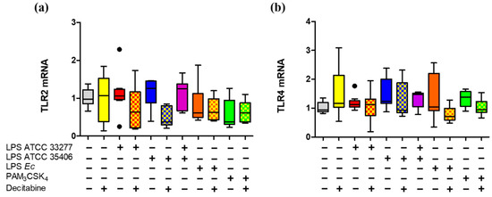 We showed that TLR2 or TLR4 mRNA levels were not affected by P. gingivalis and P. endodontalis LPS, nor did previous decitabine treatment (Figure 5).