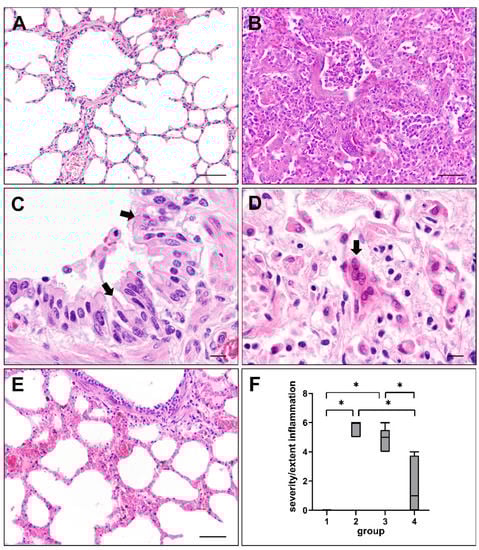 Lung lesions in canine distemper virus (CDV)-infected dogs. (A) Non-infected control lung. (B) Interstitial pneumonia of a CDV-infected dog (group 2). (C) Cytoplasmic viral inclusion bodies in airway epithelial cells (arrows) of a CDV-infected dog (group 3). (D) Syncytia formation (arrow) in a CDV-infected lung (group 2). (E) Mild pulmonary changes during subacute-chronic infection (group 4). (F) Intensity of inflammatory responses at different phases of CDV infection. Groups: 1 = non-infected controls; 2 = acute CDV infection; 3 = subacute CDV infection; 4 = subacute-chronic CDV infection; box and whisker plots display median and quartiles with maximum and minimum values. Significant differences (p ≤ 0.05, Kruskal–Wallis H test) are labelled by asterisks. Scale bars: (A,B,E): 50 µm; (C,D): 10 µm.
