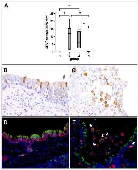 Canine distemper virus (CDV) loads and distribution in the lung. (A) Quantification of CDV antigen at different phases of infection. Note significant increase of CDV loads in the acute (group 2) and subacute infection phase (group 3), followed by a decrease in the subacute-chronic phase (group 4). Groups: 1 = non-infected controls; 2 = acute CDV infection; 3 = subacute CDV infection; 4 = subacute-chronic CDV infection; box and whisker plots display median and quartiles with maximum and minimum values. Significant differences (p ≤ 0.05, Kruskal–Wallis H test) are labelled by asterisks. (B,C) Immunohistochemistry revealed CDV antigen within airway epithelial cells (B) and intraalveolar cells (C). (D,E) Detection of CDV antigen (green) and cytokeratin (epithelial cells, red, D) and Iba-1 (histiocytic cells, red; CDV+ histiocytes, white arrows, E) by immunofluorescence. Nuclei were counterstained with bisbenzimide (blue). Scale bars: (B,C): 20 µm. (D,E): 50 µm.