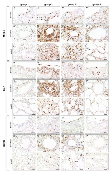 A significantly increased expression of MHC-II was found in bronchial, bronchiolar and alveolar regions during the acute (group 2) and subacute phase (group 3) compared to non-infected lungs (group 1), followed by a significant decrease in the subacute-chronic phase (group 4). Similarly, the number of Iba-1+ and CD204+ macrophages was significantly elevated in all three anatomical compartments in group 2 and 3 animals, and significantly decreased in lungs of group 4 animals (Figure 3 and Figure 4).