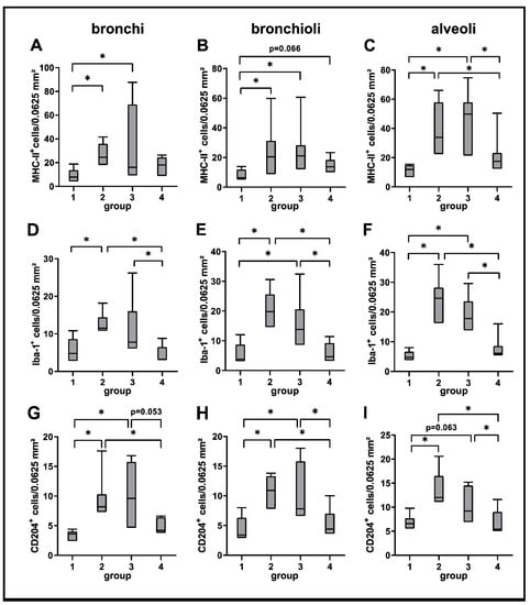 Quantification of innate cellular immune responses in canine distemper virus (CDV)-infected lungs. MHC-II (A–C), Iba-1 (D–F) and CD204 (G–I) antigen detection. Groups: 1 = non-infected control lungs; 2 = acute CDV infection; 3 = subacute CDV infection; 4 = subacute-chronic CDV infection; box and whisker plots display median and quartiles with maximum and minimum values. Significant differences (p ≤ 0.05, Kruskal–Wallis H test) are labelled by asterisks.
