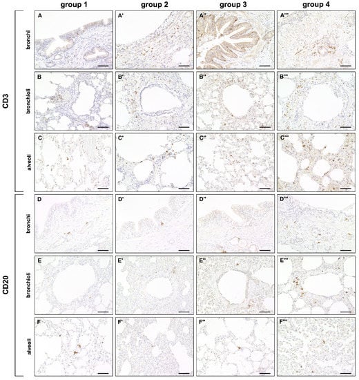A mild but significant increase of CD3+ T cells was observed in bronchial and alveolar regions at all disease stages compared to control dogs. CD20+ B cells were decreased in alveolar regions during the acute (group 2) and subacute phase (group 3) compared to control lungs (group 1). A significant increase of CD20+ B cells was found during the subacute-chronic phase (group 4) around bronchi and bronchioles compared to group 2 and group 3 and in alveolar areas compared to group 3 (Figure 5 and Figure 6).
