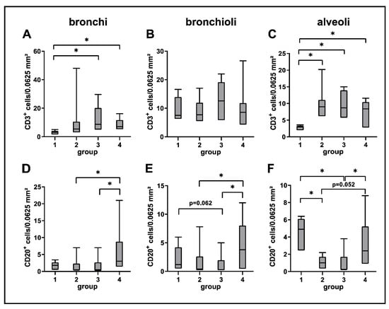 Quantification of adaptive cellular immune responses in canine distemper virus (CDV)-infected lungs. CD3 (A–C) and CD20 (D–F) antigen detection. Groups: 1 = non-infected control lungs; 2 = acute CDV infection; 3 = subacute CDV infection; 4 = subacute-chronic CDV infection; box and whisker plots display median and quartiles with maximum and minimum values. Significant differences (p ≤ 0.05, Kruskal–Wallis H test) are labelled by asterisks.
