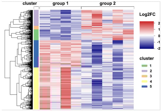 Global gene expression analyses. A heatmap illustrating the differences in expression of 3252 differentially expressed genes (DEGs) detected by pairwise comparisons of lung tissue of uninfected and CDV-infected dogs (p < 0.05). The color scheme demonstrates normalized gene expression z-score values ranging from −2 (relative low expression, in blue) to 2 (relative high expression, in red). DEGs were subdivided into five clusters with distinct expression profiles: Clusters 1–3 (green, purple and orange bar) contain upregulated genes (Log2FC > 0), whereas clusters 4 and 5 (yellow and blue bar) show downregulated genes (Log2FC < 0) in CDV-infected dogs. Groups: 1 = uninfected control lung; 2 = acute CDV infection.